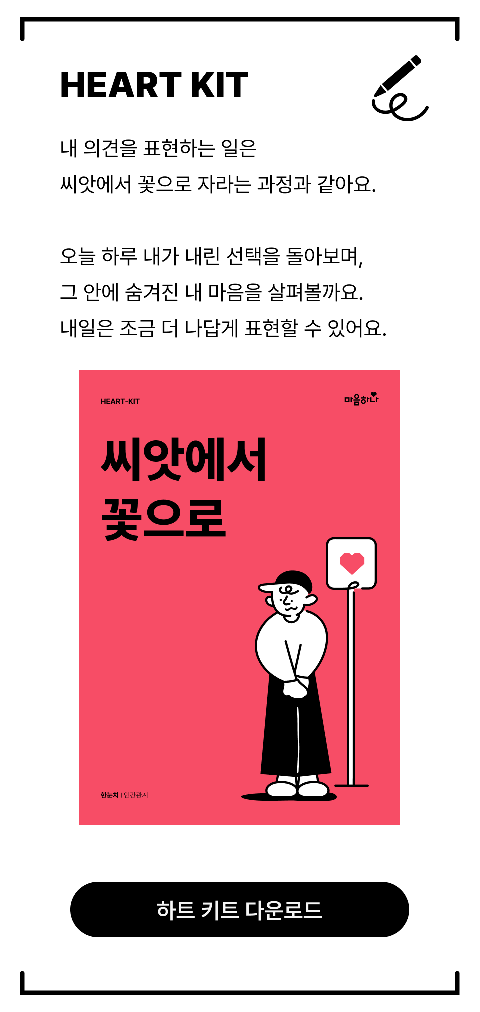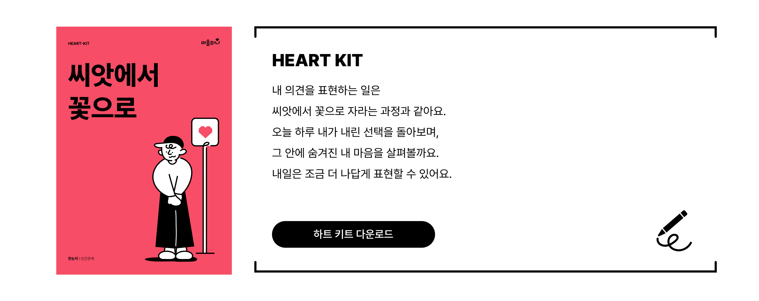 오늘 나눈 이야기를 더욱 재밌게 실천해 볼 수 있도록 아래에 ‘하트키트(HEART-KIT)를 준비해 뒀어요. 꼭 다운로드받아서 함께하길 바라요!