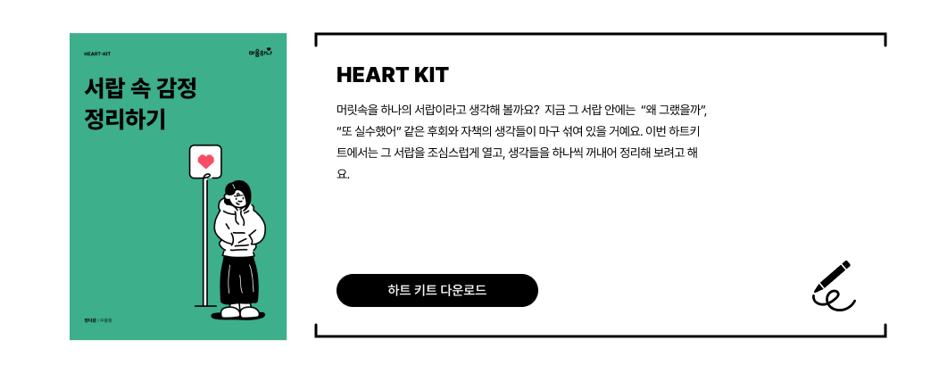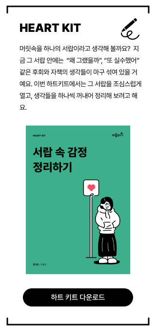 후회, 자책 등 반복되는 생각으로부터 내 마음을 지키는 더 자세한 방법이 궁금하다면 아래 ‘하트키트(HEART-KIT)’를 열어보세요. 후회와 자책 속에서 길을 잃더라도, 다시 나에게로 돌아오는 방법을 안내해 드릴게요.