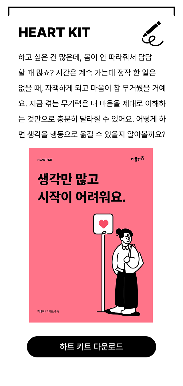 우리는 다양한 선택지를 고민하는 과정에서 에너지를 다 써버릴 만큼 ‘정보가 넘치는 시대’를 살고 있어요. 만약 지금 에너지가 바닥난 상태라면, 스스로를 몰아세우기보다 ‘지금 당장 할 수 있는 선택’부터 찾아보세요. 가볍게라도 몸을 움직여야 자책감에서 벗어나고, 마음의 활력을 되찾을 수 있을 거예요.