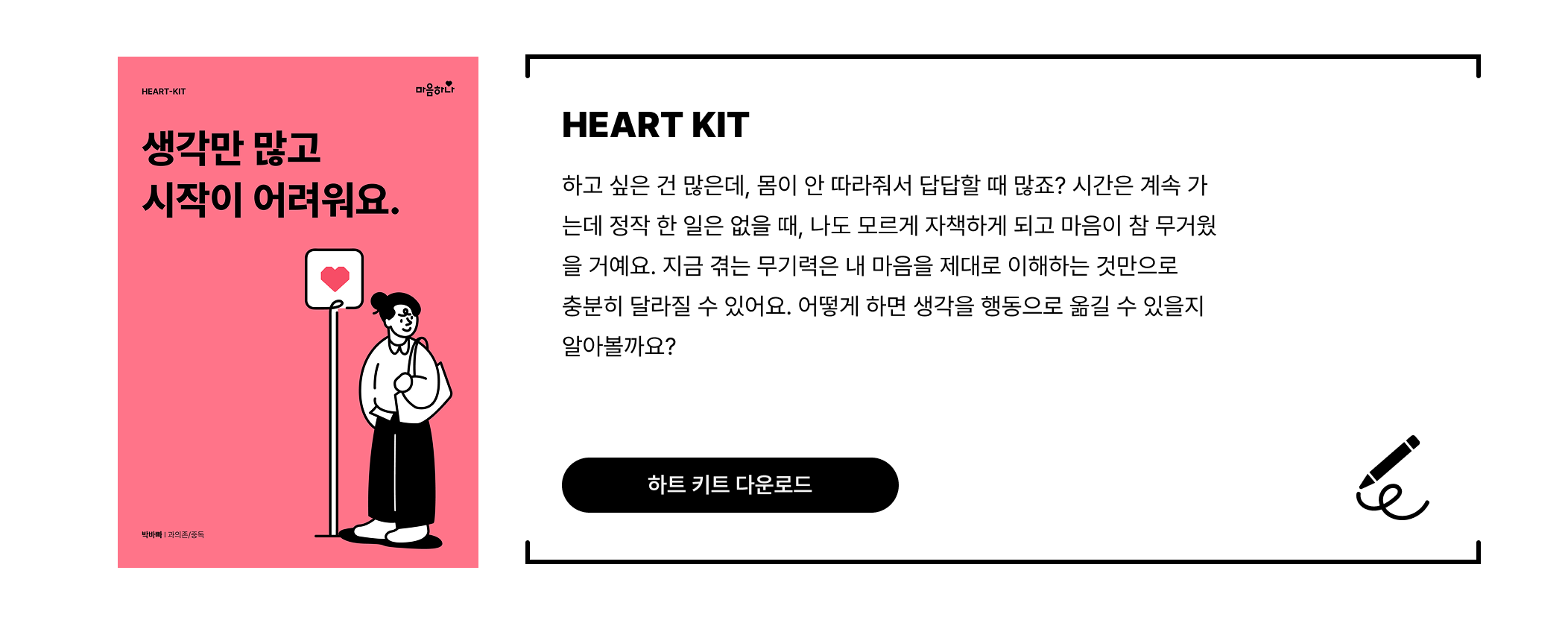 오늘 배운 내용을 혼자서도 연습할 수 있도록 ‘하트키트(HEART-KIT)’를 준비했어요. 키트를 채워나가며 나만의 ‘만족자 전략’을 직접 실천해 보세요! |
