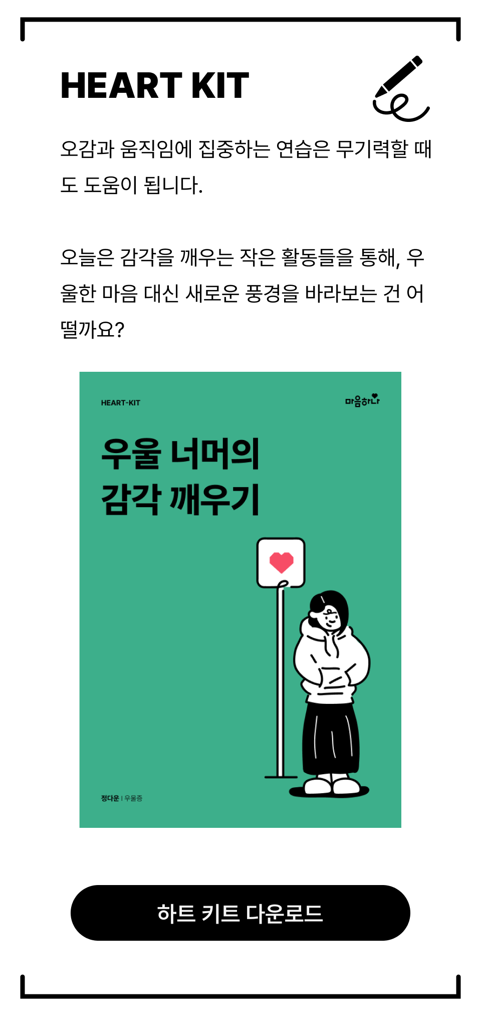 오늘은 <우울감을 회복하기 위한 첫걸음>에 대해 이야기를 나누었어요. 어쩌면 글 한 편, 약 한 알, 위로 한마디가 당장 우울을 나아지는 데 도움이 되지 않는다고 느낄 수 있어요. 그래도 병원 치료, 심리 상담, 또는 스스로 하는 어떤 노력이든 꾸준함이 중요해요. 여러분이 포기하지 않고 지친 마음을 돌보기 위한 노력을 계속 이어간다면, 분명 지금보다 편안한 마음으로 일상을 보낼 수 있을 거예요. 그런 날이 하루빨리 올 수 있도록 혼자서도 실천해 볼 수 있는 ‘하트키트(HEART KIT)’를 아래에 준비해 뒀어요. 꼭 다운로드받아서 함께하길 바라요!